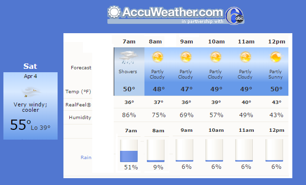 The chance of rain for the remainder of the day stays low. It drops from 51% to 6% in a matter of 2 hours and stays at 6% by late morning. We can probably expect a very rainy commute to the race, but hopefully dry up by the time the race guns go off. Be prepared to layer your clothing so you can handle the variations in temperature if you are running the longer races. Check out this article by Runners World on what to wear based on these conditions.