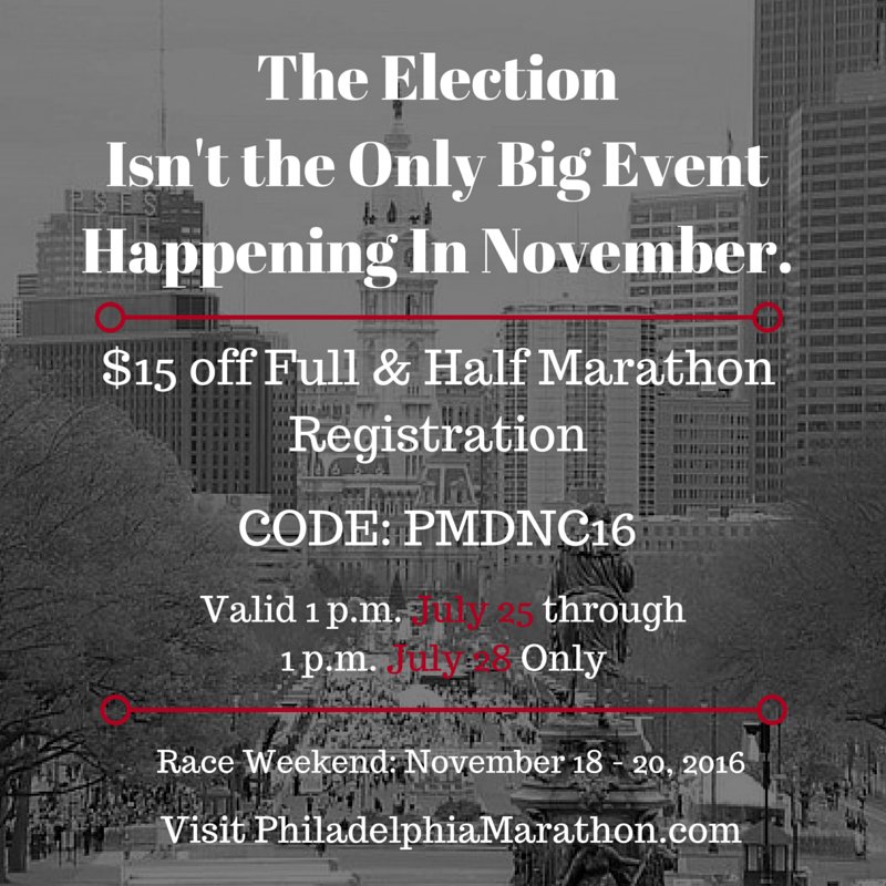 In honor of the Democratic National Convention drawing the worlds attention to the city this week, the Philadelphia Marathon is offering a $15 race discount. Just use the code “PMDNC16” at check out and you are in for $15 cheaper! The code is good for both the full and half.